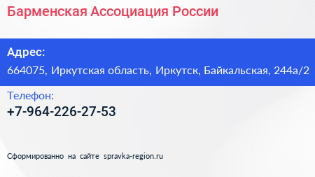 Барменская Ассоциация России по адресу 664075, Иркутская область, Иркутск, Байкальская, 244а/2 в дальнейшем Организация, размещена в следующих категориях: