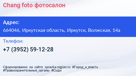Chang-foto, фотосалон по адресу 664046, Иркутская область, Иркутск, Волжская, 14а в дальнейшем Организация, размещена в следующих категориях: