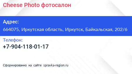 Cheese Photo, фотосалон по адресу 664075, Иркутская область, Иркутск, Байкальская, 202/6 в дальнейшем Организация, размещена в следующих категориях: