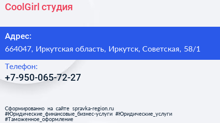 CoolGirl, студия по адресу 664047, Иркутская область, Иркутск, Советская, 58/1 в дальнейшем Организация, размещена в следующих категориях: