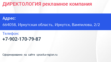 ДИРЕКТОЛОГИЯ, рекламное компания по адресу 664058, Иркутская область, Иркутск, Вампилова, 2/2 в дальнейшем Организация, размещена в следующих категориях:
