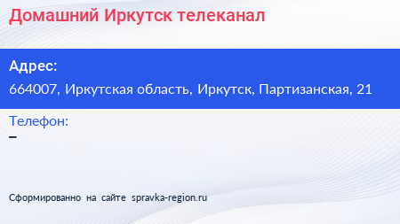 Домашний Иркутск, телеканал по адресу 664007, Иркутская область, Иркутск, Партизанская, 21 в дальнейшем Организация, размещена в следующих категориях: