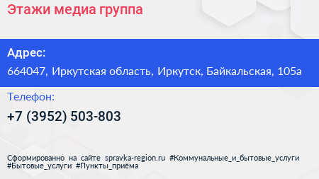 Этажи, медиа-группа по адресу 664047, Иркутская область, Иркутск, Байкальская, 105а в дальнейшем Организация, размещена в следующих категориях:
