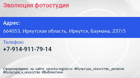 Эволюция, фотостудия по адресу 664053, Иркутская область, Иркутск, Баумана, 237/5 в дальнейшем Организация, размещена в следующих категориях: