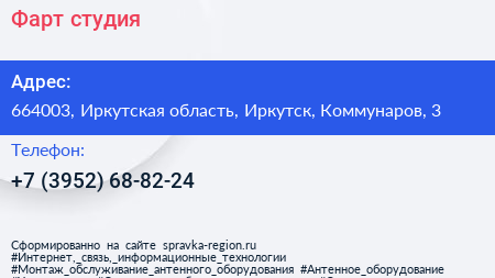 Фарт-студия по адресу 664003, Иркутская область, Иркутск, Коммунаров, 3 в дальнейшем Организация, размещена в следующих категориях: