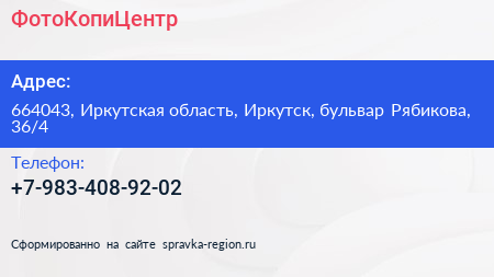 ФотоКопиЦентр по адресу 664043, Иркутская область, Иркутск, бульвар Рябикова, 36/4 в дальнейшем Организация, размещена в следующих категориях: