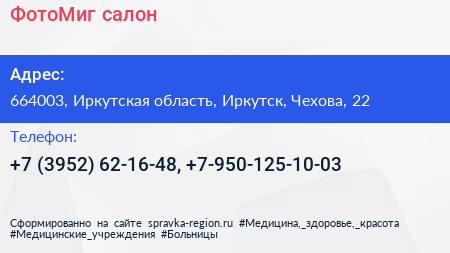 ФотоМиг, салон по адресу 664003, Иркутская область, Иркутск, Чехова, 22 в дальнейшем Организация, размещена в следующих категориях: