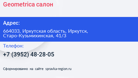 Geometrica, салон по адресу 664033, Иркутская область, Иркутск, Старо-Кузьмихинская, 41/3 в дальнейшем Организация, размещена в следующих категориях: