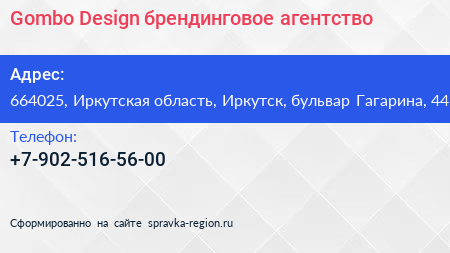 Gombo Design, брендинговое агентство по адресу 664025, Иркутская область, Иркутск, бульвар Гагарина, 44 в дальнейшем Организация, размещена в следующих категориях: