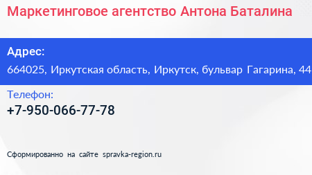 Маркетинговое агентство Антона Баталина по адресу 664025, Иркутская область, Иркутск, бульвар Гагарина, 44 в дальнейшем Организация, размещена в следующих категориях: