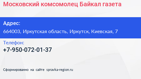 Московский комсомолец Байкал, газета по адресу 664003, Иркутская область, Иркутск, Киевская, 7 в дальнейшем Организация, размещена в следующих категориях: