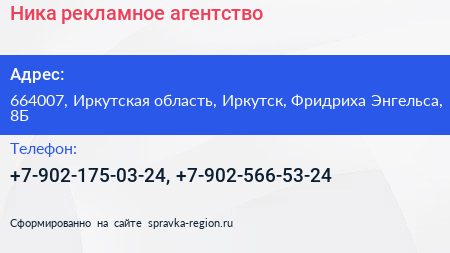 Ника, рекламное агентство по адресу 664007, Иркутская область, Иркутск, Фридриха Энгельса, 8Б в дальнейшем Организация, размещена в следующих категориях: