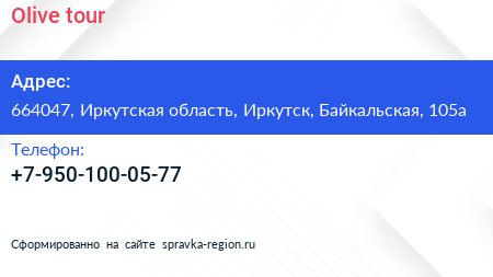 Olive tour по адресу 664047, Иркутская область, Иркутск, Байкальская, 105а в дальнейшем Организация, размещена в следующих категориях: