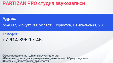 PARTIZAN PRO, студия звукозаписи по адресу 664007, Иркутская область, Иркутск, Байкальская, 23 в дальнейшем Организация, размещена в следующих категориях: