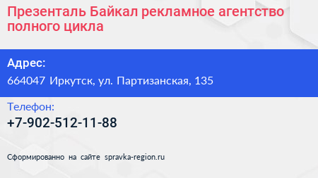 Презенталь Байкал, рекламное агентство полного цикла по адресу 664047 Иркутск, ул. Партизанская, 135 в дальнейшем Организация, размещена в следующих категориях: