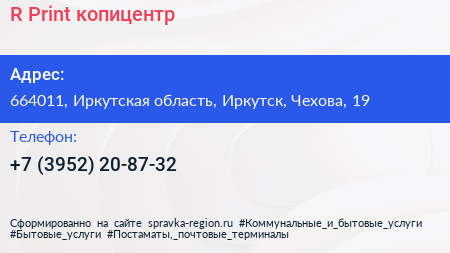 R-Print, копицентр по адресу 664011, Иркутская область, Иркутск, Чехова, 19 в дальнейшем Организация, размещена в следующих категориях: