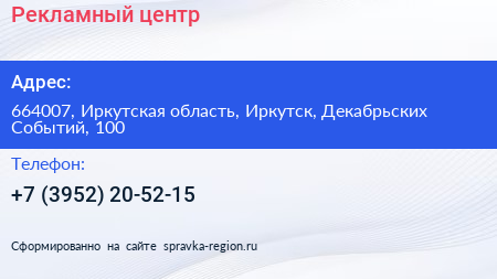 Рекламный центр по адресу 664007, Иркутская область, Иркутск, Декабрьских Событий, 100 в дальнейшем Организация, размещена в следующих категориях:
