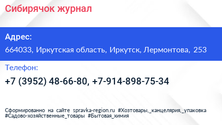 Сибирячок, журнал по адресу 664033, Иркутская область, Иркутск, Лермонтова, 253 в дальнейшем Организация, размещена в следующих категориях:
