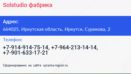 Solstudio, фабрика по адресу 664025, Иркутская область, Иркутск, Сурикова, 2 в дальнейшем Организация, размещена в следующих категориях: