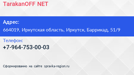 TarakanOFF.NET по адресу 664019, Иркутская область, Иркутск, Баррикад, 51/9 в дальнейшем Организация, размещена в следующих категориях: