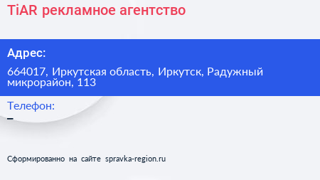 TiAR, рекламное агентство по адресу 664017, Иркутская область, Иркутск, Радужный микрорайон, 113 в дальнейшем Организация, размещена в следующих категориях: