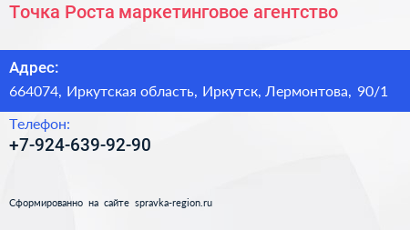 Точка Роста, маркетинговое агентство по адресу 664074, Иркутская область, Иркутск, Лермонтова, 90/1 в дальнейшем Организация, размещена в следующих категориях: