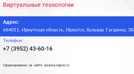 Виртуальные технологии по адресу 664011, Иркутская область, Иркутск, бульвар Гагарина, 38а в дальнейшем Организация, размещена в следующих категориях: