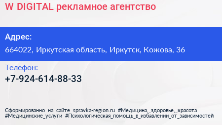 W DIGITAL, рекламное агентство по адресу 664022, Иркутская область, Иркутск, Кожова, 36 в дальнейшем Организация, размещена в следующих категориях: