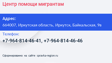 Центр помощи мигрантам по адресу 664007, Иркутская область, Иркутск, Байкальская, 9в в дальнейшем Организация, размещена в следующих категориях: