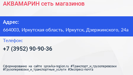 АКВАМАРИН, сеть магазинов по адресу 664003, Иркутская область, Иркутск, Дзержинского, 24а в дальнейшем Организация, размещена в следующих категориях: