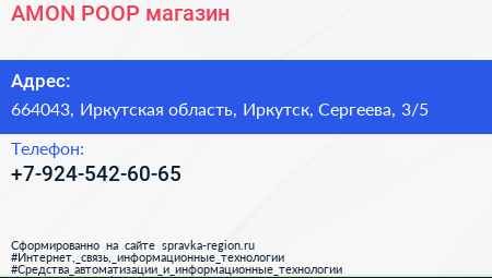 AMON POOP, магазин по адресу 664043, Иркутская область, Иркутск, Сергеева, 3/5 в дальнейшем Организация, размещена в следующих категориях: