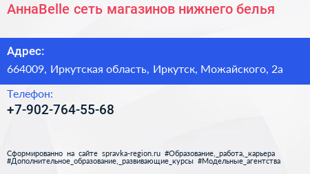 АннаBelle, сеть магазинов нижнего белья по адресу 664009, Иркутская область, Иркутск, Можайского, 2а в дальнейшем Организация, размещена в следующих категориях: