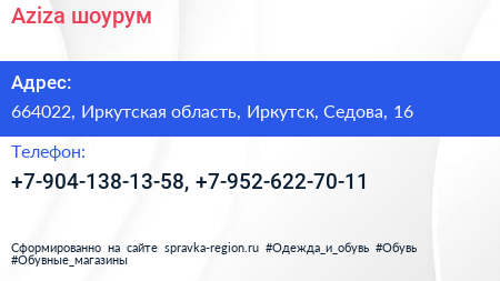 Aziza, шоурум по адресу 664022, Иркутская область, Иркутск, Седова, 16 в дальнейшем Организация, размещена в следующих категориях: