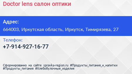 Doctor-lens, салон оптики по адресу 664003, Иркутская область, Иркутск, Тимирязева, 27 в дальнейшем Организация, размещена в следующих категориях: