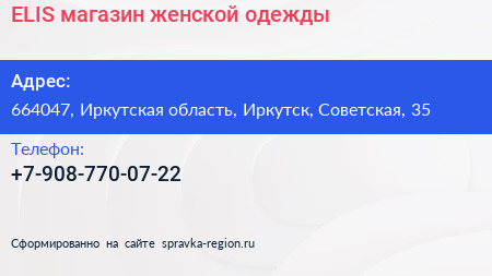 ELIS, магазин женской одежды по адресу 664047, Иркутская область, Иркутск, Советская, 35 в дальнейшем Организация, размещена в следующих категориях: