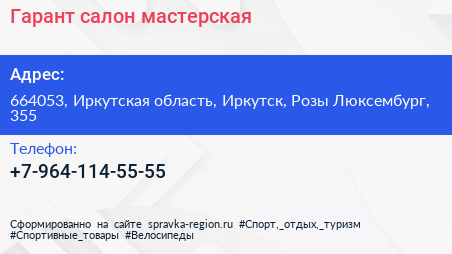 Гарант, салон-мастерская по адресу 664053, Иркутская область, Иркутск, Розы Люксембург, 355 в дальнейшем Организация, размещена в следующих категориях:
