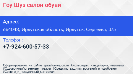 Гоу Шуз, салон обуви по адресу 664043, Иркутская область, Иркутск, Сергеева, 3/5 в дальнейшем Организация, размещена в следующих категориях: