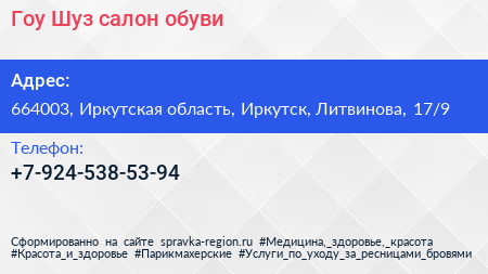 Гоу Шуз, салон обуви по адресу 664003, Иркутская область, Иркутск, Литвинова, 17/9 в дальнейшем Организация, размещена в следующих категориях: