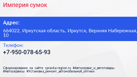 Империя сумок по адресу 664022, Иркутская область, Иркутск, Верхняя Набережная, 10 в дальнейшем Организация, размещена в следующих категориях: