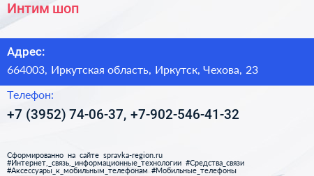 Интим-шоп по адресу 664003, Иркутская область, Иркутск, Чехова, 23 в дальнейшем Организация, размещена в следующих категориях: