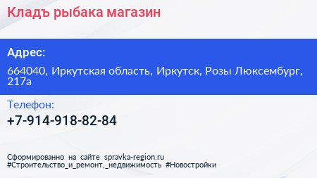 Кладъ рыбака, магазин по адресу 664040, Иркутская область, Иркутск, Розы Люксембург, 217а в дальнейшем Организация, размещена в следующих категориях: