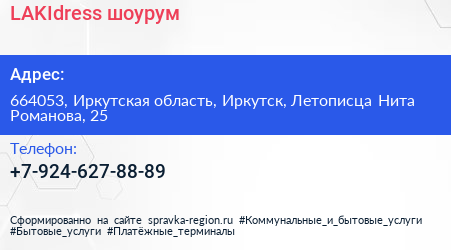 LAKIdress, шоурум по адресу 664053, Иркутская область, Иркутск, Летописца Нита Романова, 25 в дальнейшем Организация, размещена в следующих категориях: