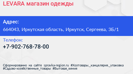 LEVARA, магазин одежды по адресу 664043, Иркутская область, Иркутск, Сергеева, 3Б/1 в дальнейшем Организация, размещена в следующих категориях: