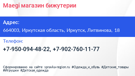 Maegi, магазин бижутерии по адресу 664003, Иркутская область, Иркутск, Литвинова, 18 в дальнейшем Организация, размещена в следующих категориях:
