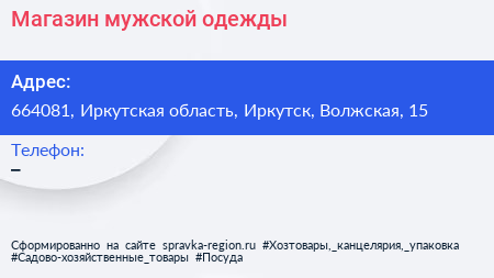 Магазин мужской одежды по адресу 664081, Иркутская область, Иркутск, Волжская, 15 в дальнейшем Организация, размещена в следующих категориях: