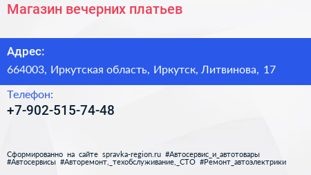 Магазин вечерних платьев по адресу 664003, Иркутская область, Иркутск, Литвинова, 17 в дальнейшем Организация, размещена в следующих категориях:
