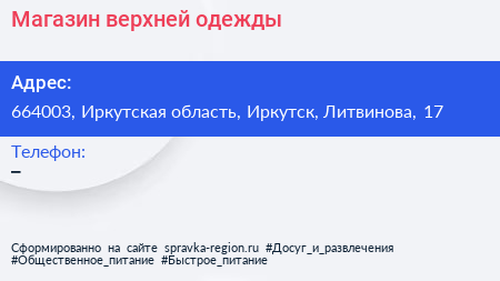 Магазин верхней одежды по адресу 664003, Иркутская область, Иркутск, Литвинова, 17 в дальнейшем Организация, размещена в следующих категориях: