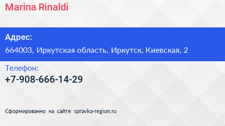 Marina Rinaldi по адресу 664003, Иркутская область, Иркутск, Киевская, 2 в дальнейшем Организация, размещена в следующих категориях:
