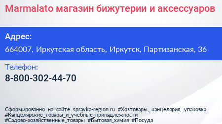 Marmalato, магазин бижутерии и аксессуаров по адресу 664007, Иркутская область, Иркутск, Партизанская, 36 в дальнейшем Организация, размещена в следующих категориях: