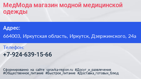 МедМода, магазин модной медицинской одежды по адресу 664003, Иркутская область, Иркутск, Дзержинского, 24а в дальнейшем Организация, размещена в следующих категориях: